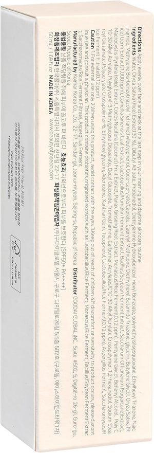 Water, Oryza Sativa (Rice) Extract (30%), Dibutyl Adipate, Propanediol, Diethylamino Hydroxybenzoyl Hexyl Benzoate, Polymethylsilsesquioxane, Ethylhexyl Triazone, Niacinamide, Methylene Bis-benzotriazolyl Tetramethylbutylphenol, Coco-caprylate/Caprate, Caprylyl Methicone, Diethylhexyl Butamido Triazone, Glycerin, Butylene Glycol, Oryza Sativa (Rice) Germ Extract, Camellia Sinensis Leaf Extract, Lactobacillus/Pumpkin Ferment Extract, Bacillus/Soybean Ferment Extract, Saccharum Officinarum (Sugarcane) Extract, Macrocystis Pyrifera (Kelp) Extract, Cocos Nucifera (Coconut) Fruit Extract, Panax Ginseng Root Extract, Camellia Sinensis Leaf Extract, Monascus/Rice Ferment, Pentylene Glycol, Behenyl Alcohol, Poly C10-30 Alkyl Acrylate, Polyglyceryl-3 Methylglucose Distearate, Decyl Glucoside, Tromethamine, Carbomer, Acrylates/C10-30 Alkyl Acrylate Crosspolymer, 1,2-Hexanediol,Sodium Stearoyl Glutamate, Polyacrylate Crosspolymer-6, Ethylhexylglycerin, Adenosine, Xanthan Gum, Tocopherol, Lactobacillus/Rice Ferment, Aspergillus Ferment, Saccharomyces/Rice Ferment Filtrate