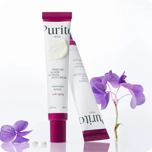 The Purito Timeless Bloom Retinol Spot Cream is a gentle yet effective treatment designed to target signs of aging and improve skin texture. Formulated with 0.1% pure retinol, bakuchiol, and Jeju hydrangea extract, this cream works synergistically to reduce wrinkles, enhance elasticity, and refine pores. Its smooth, dense texture absorbs easily, leaving the skin dewy and bouncy.